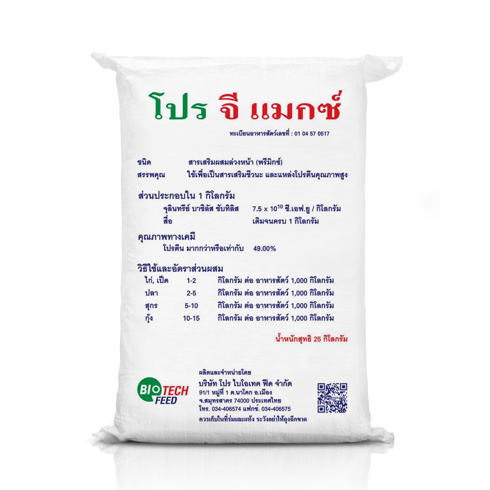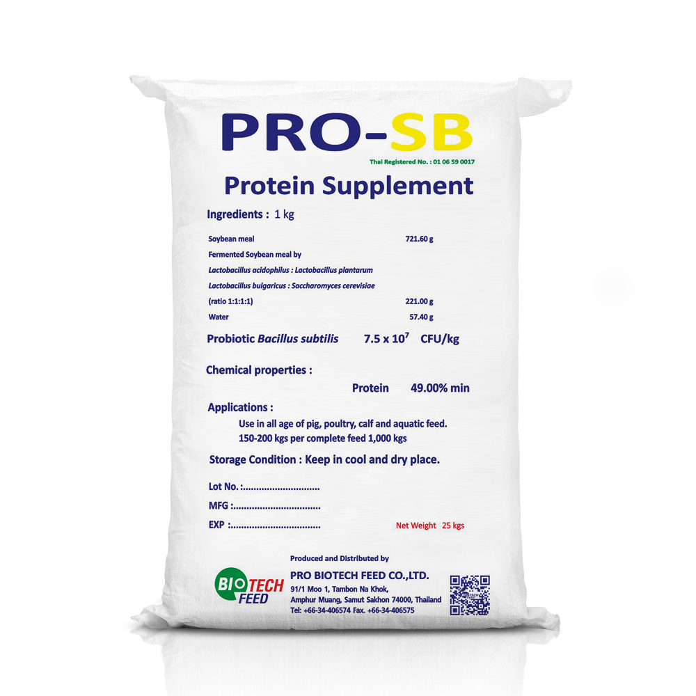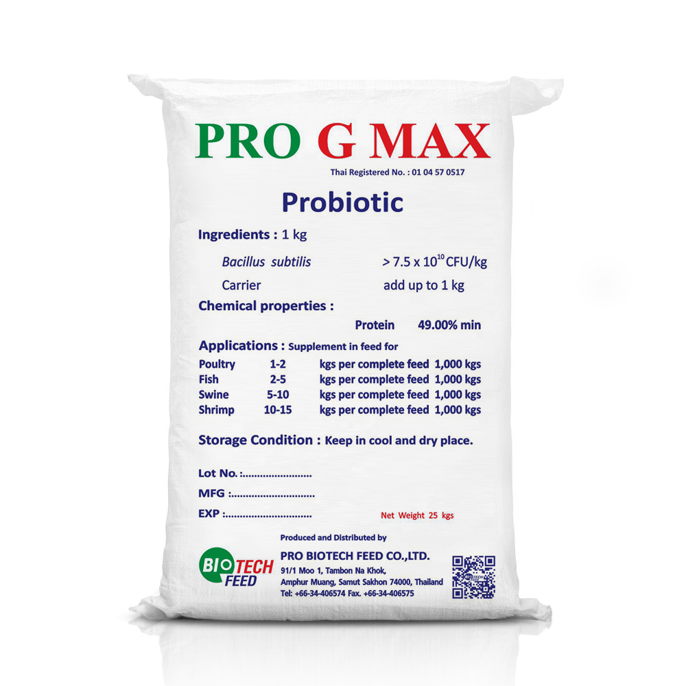 สำหรับสัตว์ผลิตจากกากถั่วเหลืองคุณภาพสูงที่ผ่านกระบวนการหมักด้วยวิธีธรรมชาติ โดยแบคทีเรียที่มีความสามารถในการสร้างเอนไซม์โปรติเอส (Protease) ออกมาภายนอกเซลล์ ทำหน้าที่ย่อยโมเลกุลโปรตีนขนาดใหญ่ให้มีขนาดเล็กลงจนได้เปปไทด์สายสั้นและกรดอะมิโนอิสระ ภายหลังกระบวนการหมักและอบแห้งจะยังคงมีจุลินทรีย์กลุ่มโปรไบโอติก ได้แก่ Bacillus subtilis ที่มีชีวิตในผลิตภัณฑ์จำนวนมากกว่า 10^10 CFU/kg หรือหนึ่งหมื่นล้านเซลล์ต่อกิโลกรัม เนื่องจากจุลินทรีย์ดังกล่าวสามารถสร้างสปอร์ที่ทนความร้อนได้สูง และย่อยสลายโปรตีนได้อย่างมีประสิทธิภาพ อีกทั้งยังมีความสามารถในการผลิตสาร Bacteriocin ที่สามารถต่อต้านการเจริญของจุลินทรีย์กลุ่มอื่น โดยเฉพาะอย่างยิ่งจุลินทรีย์ก่อโรค ด้วยคุณสมบัติของ PRO G MAX ที่เป็นโปรตีนที่ย่อยและดูดซึมได้ง่าย จึงสามารถนำ PRO G MAX ไปใช้ทดแทนโปรตีนเข้มข้น (Soy protein concentrate) หรือใช้ร่วมกับปลาป่น (Fish meal) ในสูตรอาหารได้